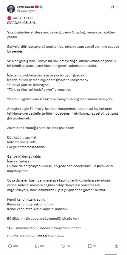 Bu aşamanın, bölgede yürütülen çok katmanlı planın “sadece bir perde” olduğunu belirten Sayan, Türkiye’nin bu bölünmeyi doğal bir ulusal güvenlik tehdidi olarak algılayacağını ifade etti.